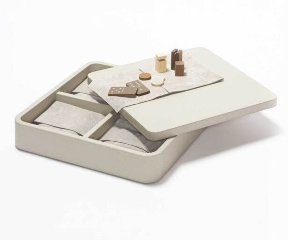 The three-game set from Giobagnara X Poltrona Frau consists of a wooden box covered in Pelle Frau® leather with an inlaid top on which checkers and chess can be played. Four compartments, each with its own suede pochette, hold the maple and walnut chess pieces; maple and walnut checkers pieces with Pelle Frau® inlays; and walnut dominoes with laser-etched graphics.