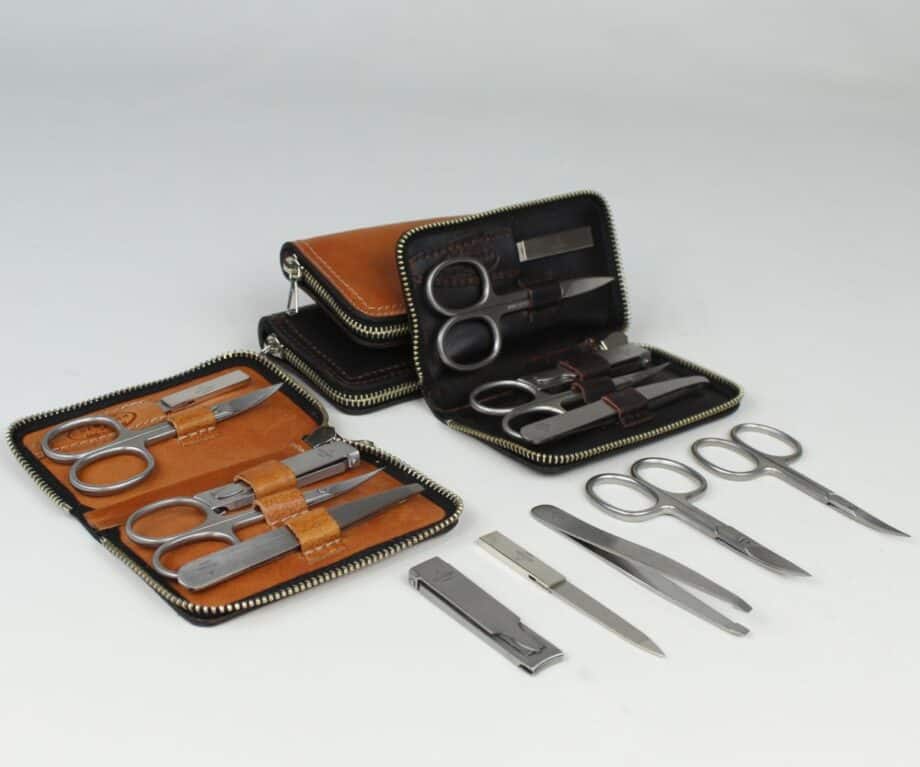 Courtesy of F. Hammann, these manicure sets come in a leather case with a metal zipper, made from vegetable tanned Alpina Bullhide, with a leather lining. The extra-flat and patented metal zipper makes the set very slim and pleasantly soft, whilst the set includes Eschenburg utensils made from stainless steel: a nail file, nail scissors, extra slim nail clippers, cuticle scissors and tweezers.