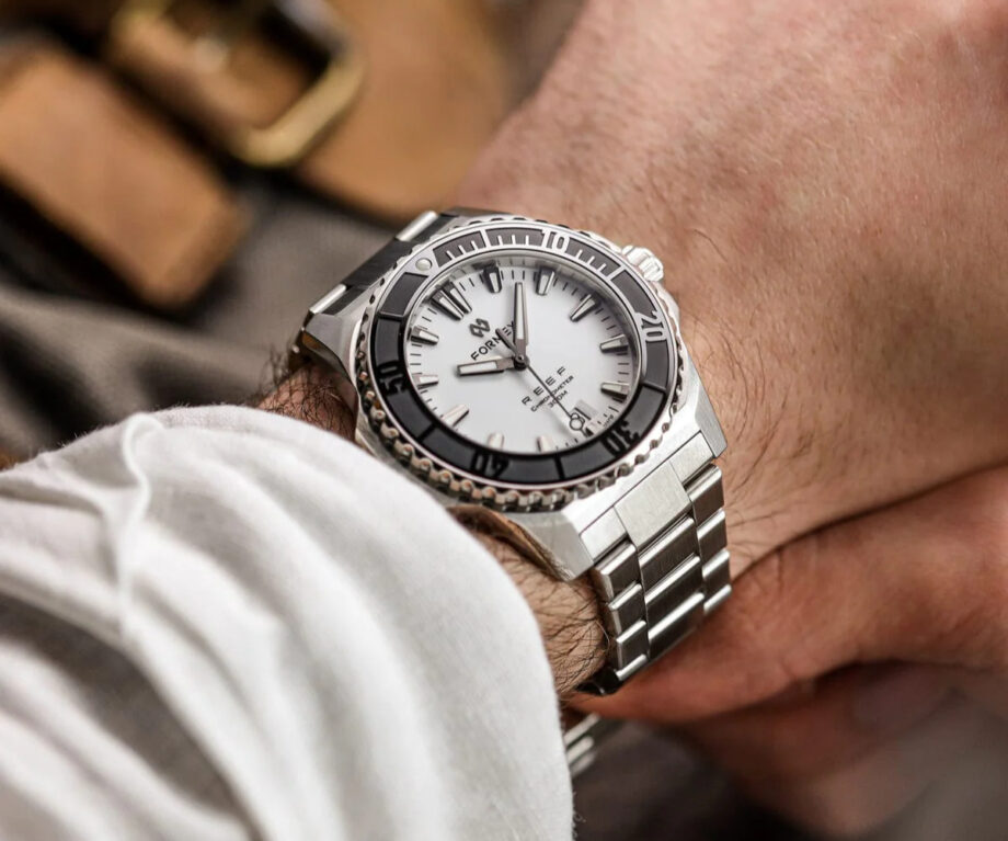 The striking 42mm Formex REEF diver has a highly distinctive stainless-steel case which provides both deep dive security and aesthetic symmetry. A double gasket protects the crown, and the watch is fully tested to 300m of water resistance. Mirror polished bevels and brushed surfaces throughout the design create a pleasing balance between elegance and the brand’s high-octane spirit.