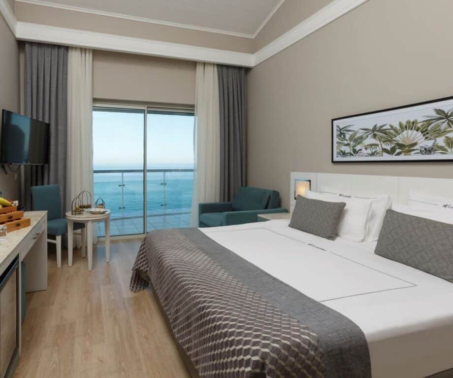 Our Standard Sea View Room was modern, airy and spacious, with a small balcony overlooking the hotel pool and beach, and the Gulf of Antalya beyond.