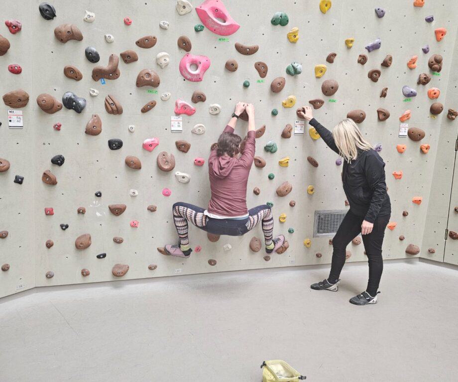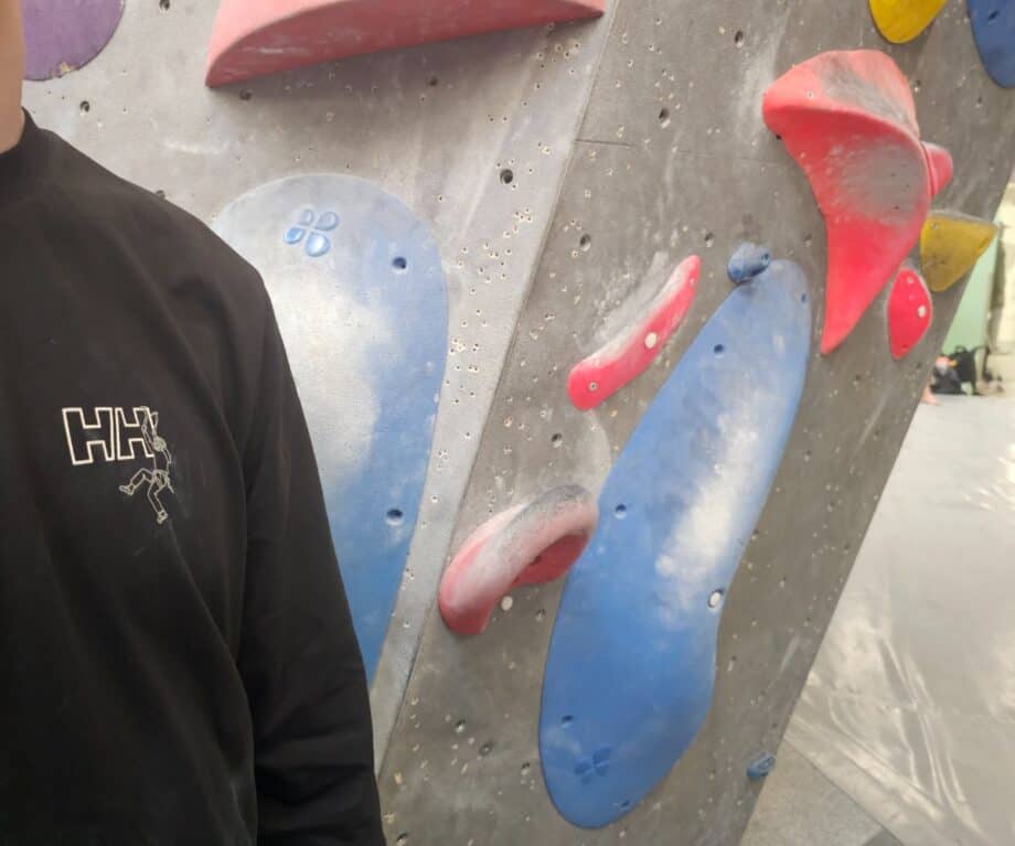 Thankfully, we were bouldering at low levels so all we needed was climbing shoes – no ropes or harnesses, just us, the wall and gravity… and crucially a well-padded landing.