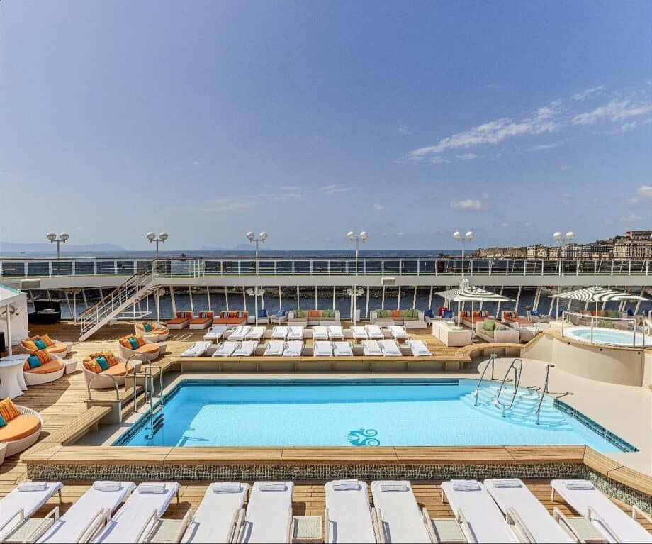 Sun-loungers are spaced around the Seahorse swimming pool and two whirlpools, with waiters on hand to take drinks orders.