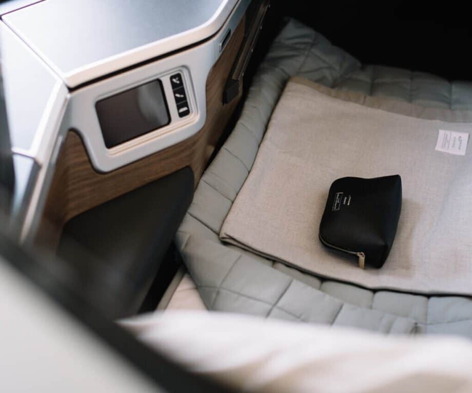 Expect luxury bedding from The White Company, including a duvet, pillow, and mattress topper, plus an amenity kit stocked with essentials like an eye mask, socks, and toiletries. These little extras are actually some of my favourite bits about Business Class – it really elevates the experience.