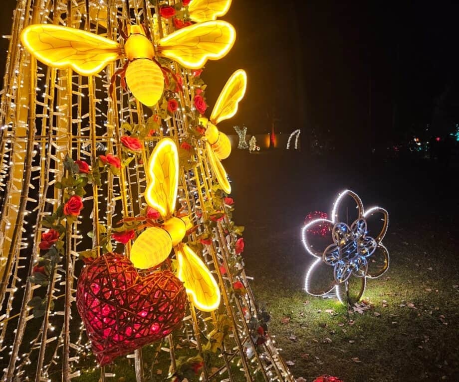 Midway through your journey, there’s a spot where you can warm yourselves with a steaming beverage, before continuing to enjoy the rest of the display. Some trees are illuminated and shift colours in harmony with music, while oversized, glowing insects come to life with dynamic animations.