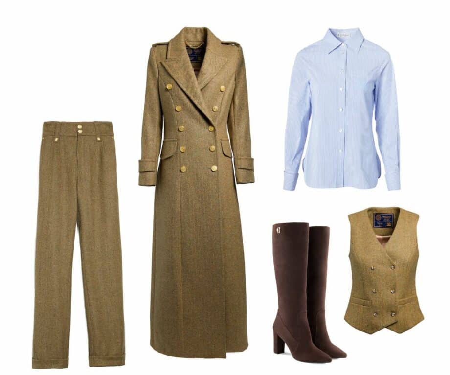 Jade appears in the Westminster Tweed look (and alternate chocolate houndstooth variants) which include the Belgravia blazer, Hampton waistcoat and high-waisted wide-leg trouser set. The fabrics are drawn from centuries-old Scottish mills, cut and sewn by artisan hands in Britain. The blazer’s structure is bold yet elegant—with defined shoulders, narrow waist and a finish that signals both confidence and refinement.