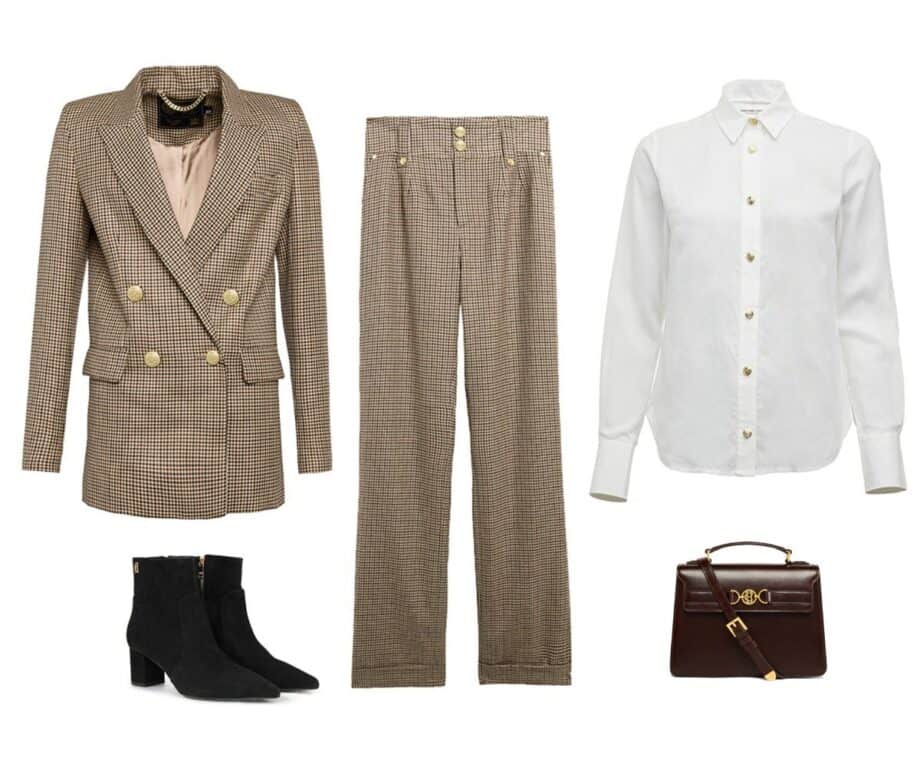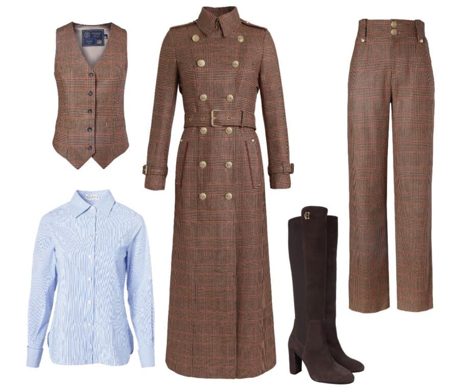 Clare is pictured in the Clarence Check Merlot look—a nod to rich burgundies and classic checks that signal heritage without nostalgia. The ensemble features a tailored blazer, waistcoat and coordinating skirt or trousers in the check fabric, finished with Holland Cooper’s signature gold hardware and precision cut. The overall effect is one of poised strength: garments that sit cleanly, flatter the form and carry authority. It’s the sort of tailoring that announces capability from the boardroom to the broadcast booth.