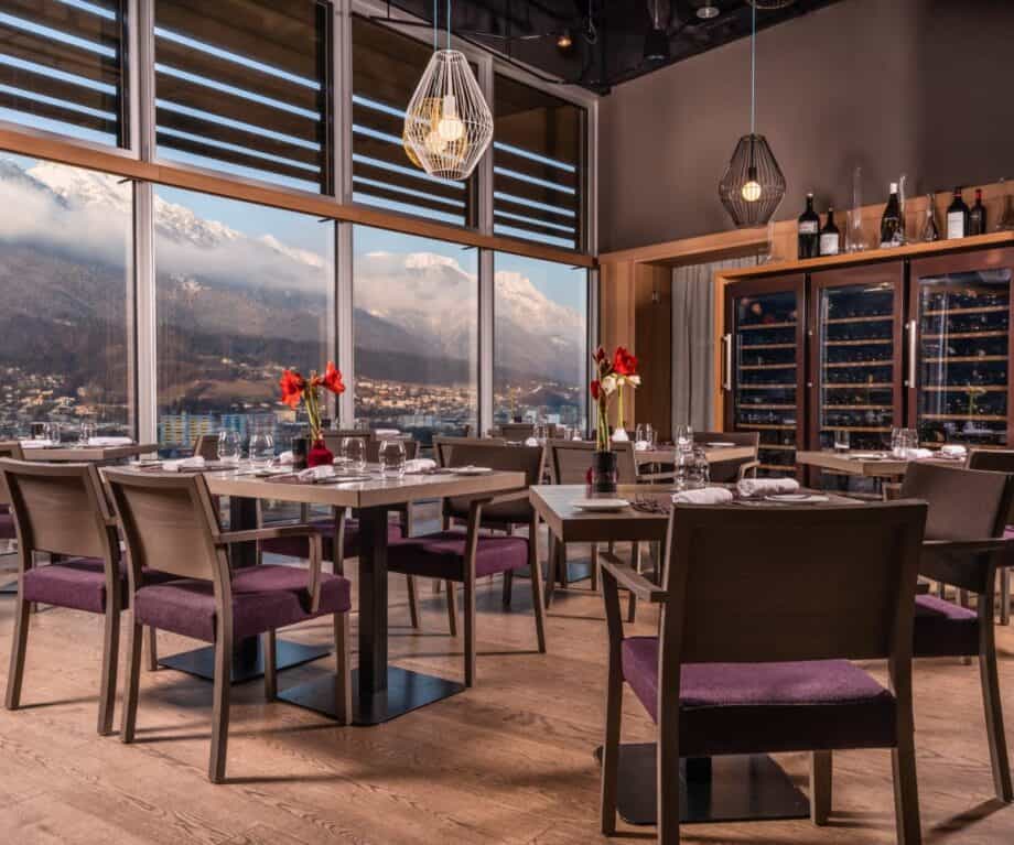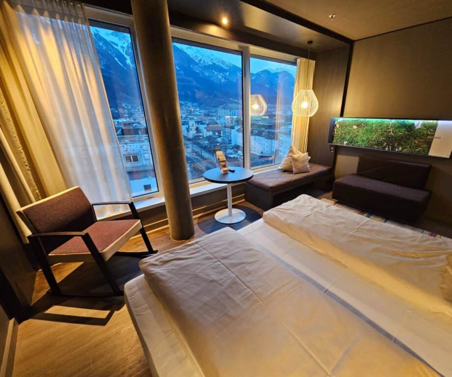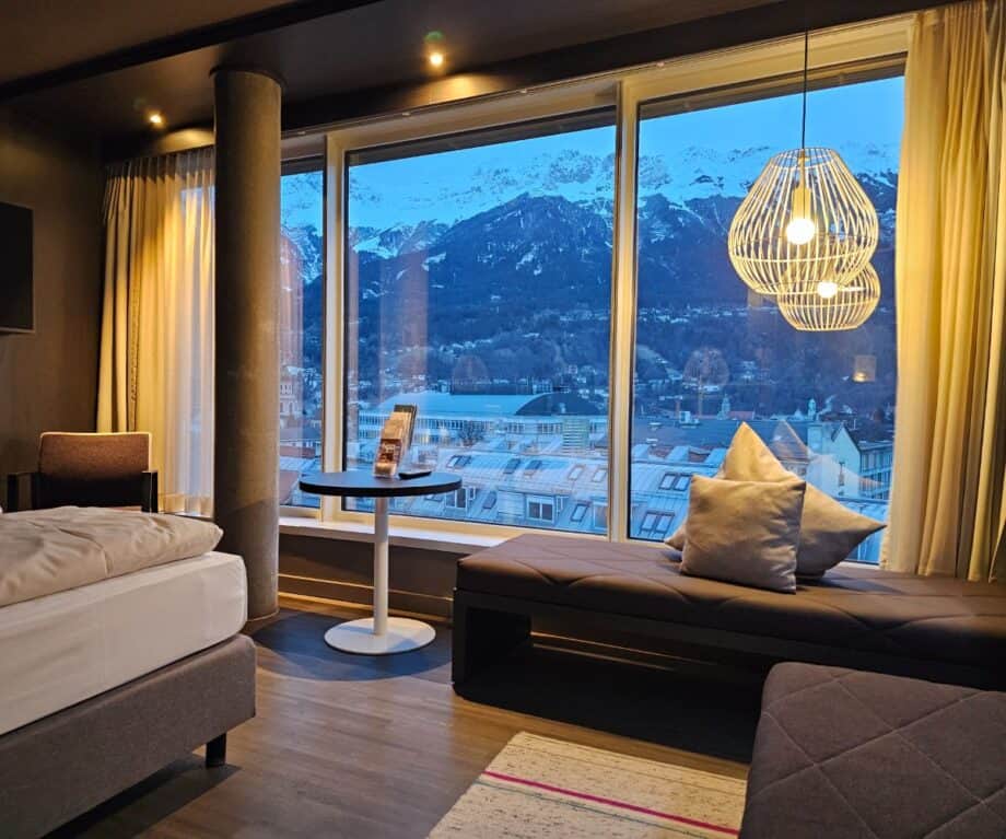 The view from the room is nothing short of spectacular. Below, the colourful buildings of Innsbruck line the streets, their vibrant façades standing out against the backdrop of snow-capped mountains.