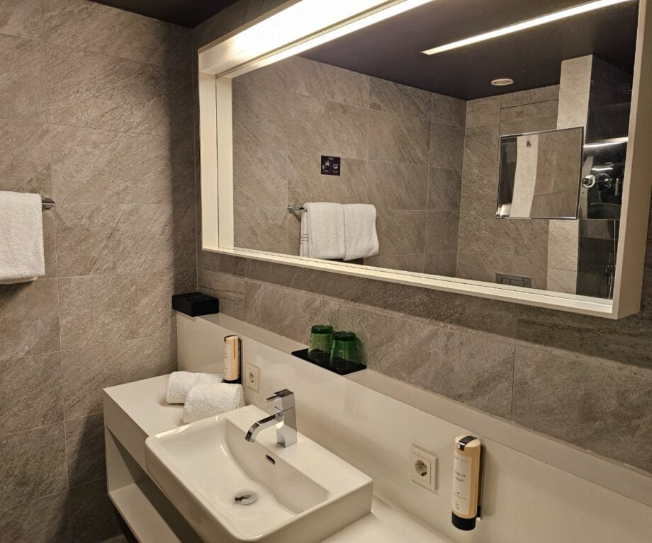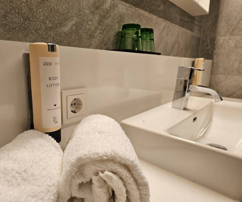 The en suite bathroom at ADLERS is both modern and elegant, offering everything you need. It’s well-lit and features a panoramic mirror, basin, WC and a spacious walk-in shower. Unlike in the UK, where wiring regulations are more restrictive, it’s common in many European countries, including Austria, to have sockets in the bathroom and here is no exception.
