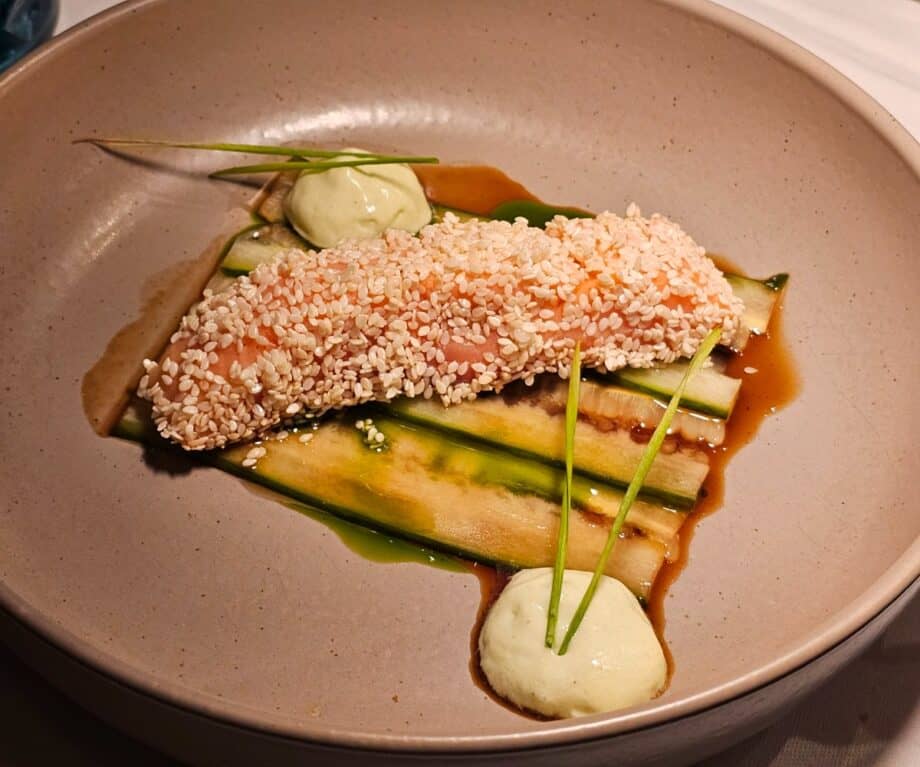 We particularly enjoyed the black garlic cream soup with shrimp. And the pickled wild salmon with gin, cucumber, sesame and Ponzu was also a great option.