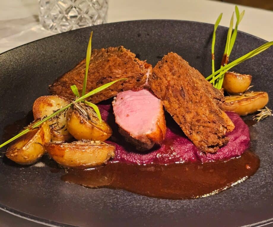 For the mains, we recommend the duet of duck served with red cabbage and rosemary potatoes, or the Hokkaido pumpkin squash with salmon.