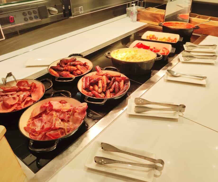 There’s a prolonged bar (in addition to a smaller one which was closed on the time of our morning go to), loads of cooked breakfast choices, in addition to fruit, yoghurts, pastries, tea/espresso, and so forth.