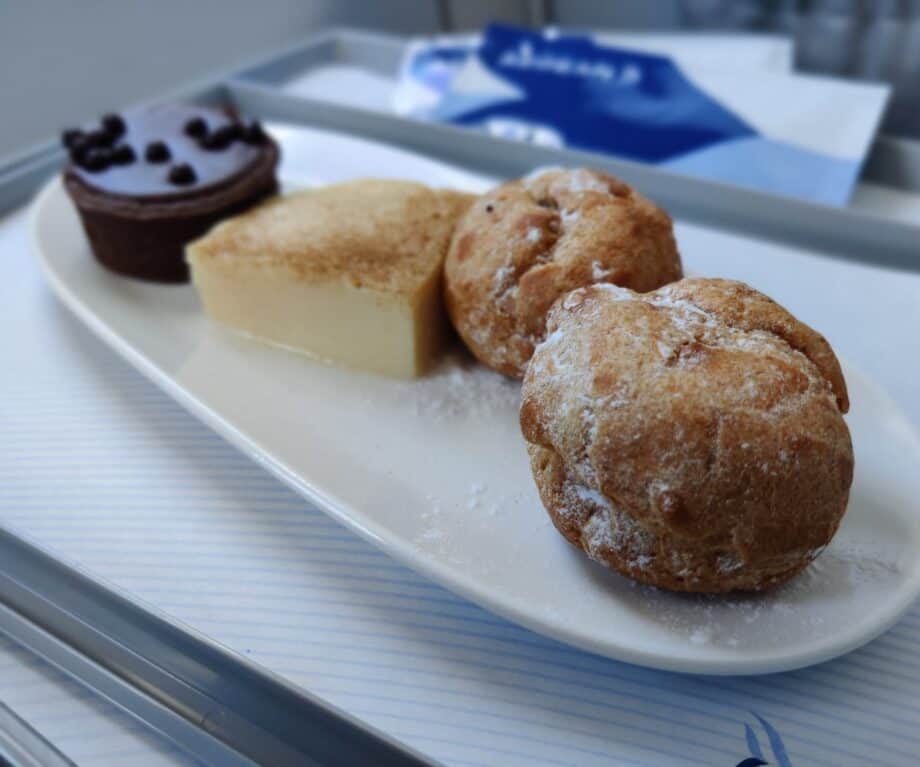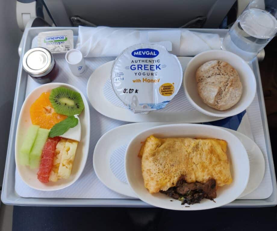 For our outbound flight, breakfast on board consisted of a recent fruit platter with Manouri cheese, plus a alternative of a morning roll or croissant, with butter and a strawberry marmalade. There was additionally a scorching entrée alternative by Executive Chef Lefteris Lazzarou of Omelet with Smoked Chicken, Leek, Mushrooms and Thyme (pictured) or Omelet ‘Stourgato’ with Smoked Salmon and Spicy Tomato Sauce.