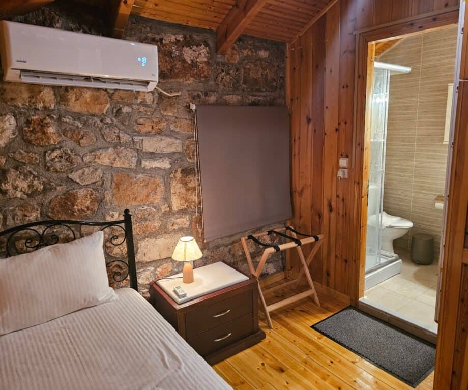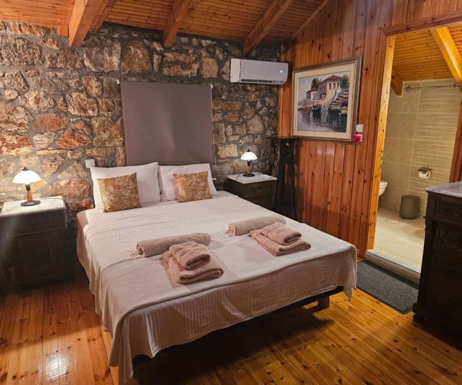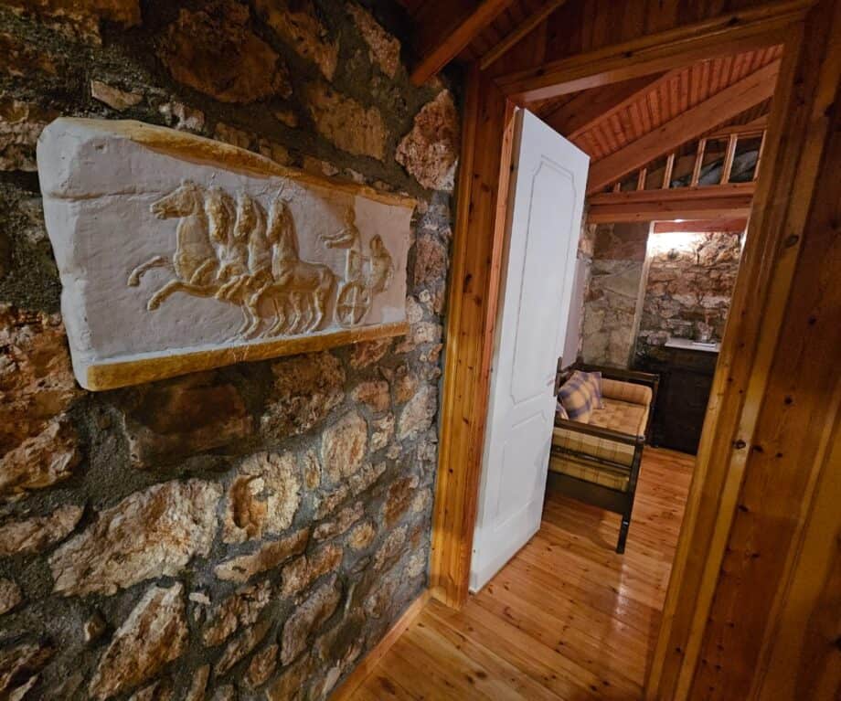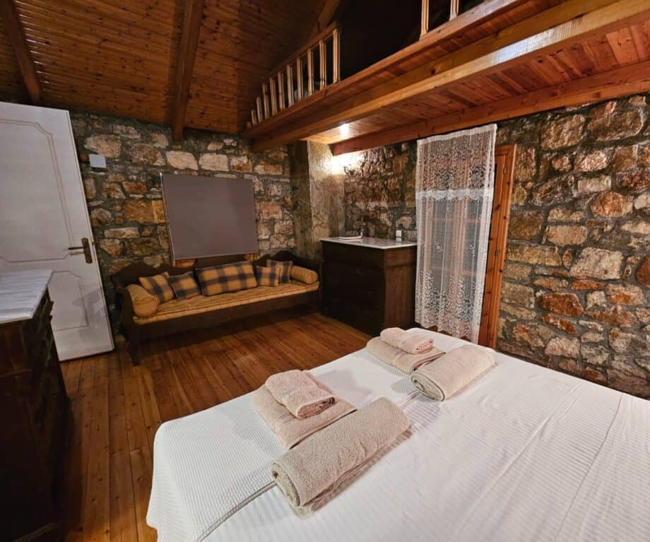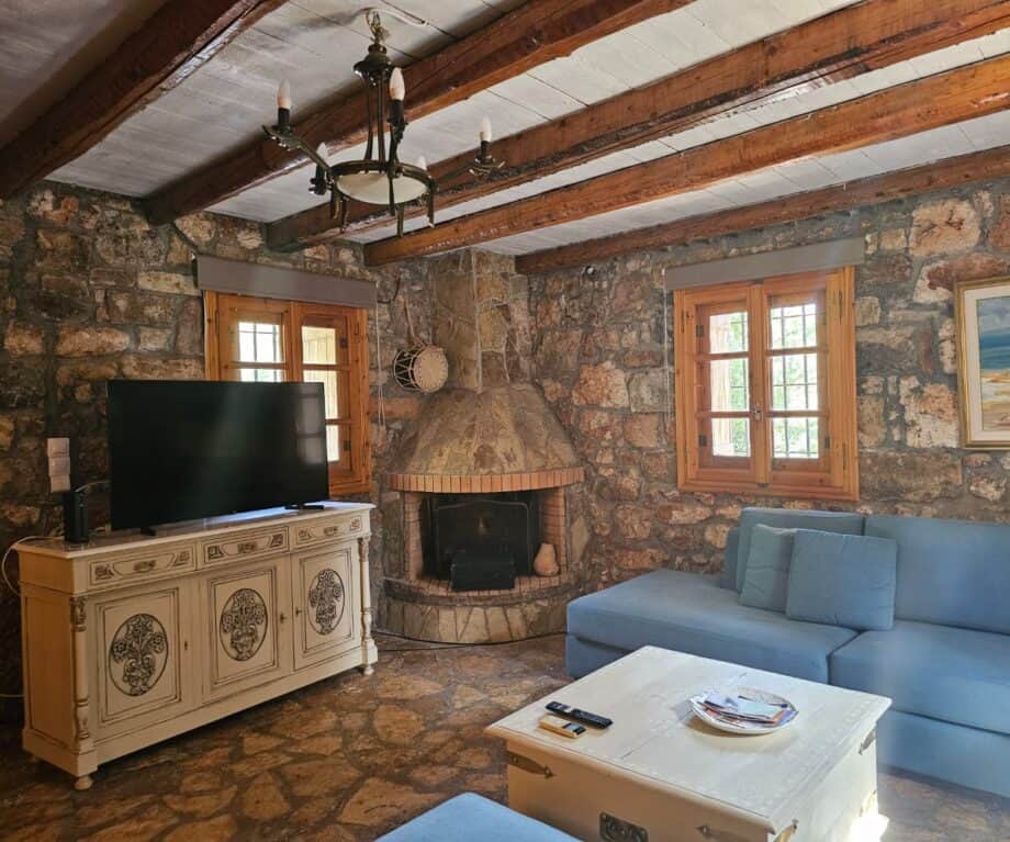 The main space is open, stone-floored, and beautifully spare. A fireplace lounges in one corner, though in the Summer it’s more decorative than practical. We never touched the TV—preferring instead to eat out and enjoy each other’s company—but it’s there if you want it.