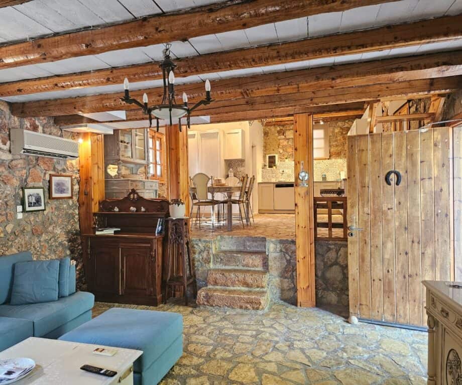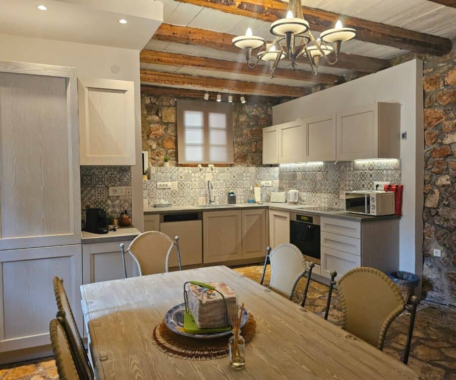 Just a few steps up is the dining area and kitchen: a triumph of tradition-meets-tech. Rustic ceiling beams and earthy tones frame Miele appliances, a DeLonghi coffee machine, integrated fridge-freezer, and every gadget from toaster to toasted sandwich maker. This is a kitchen that makes you want to cook, if it weren’t for three lovely tavernas within walking distance.