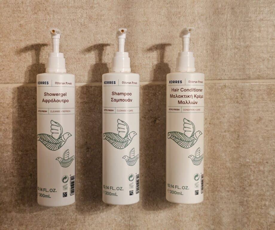Korres citrus shampoo, conditioner, body gel and hand wash provide a gentle nod to Greek skincare, infusing the rooms with a fresh, herbal scent.