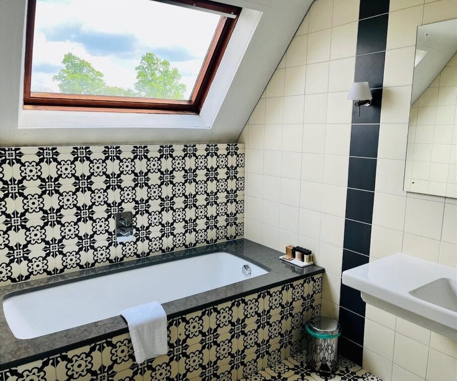 Generously sized and flooded with light from a large Velux window. Chic black-and-white tiles framed a deep soaking tub, perfect after a day exploring.