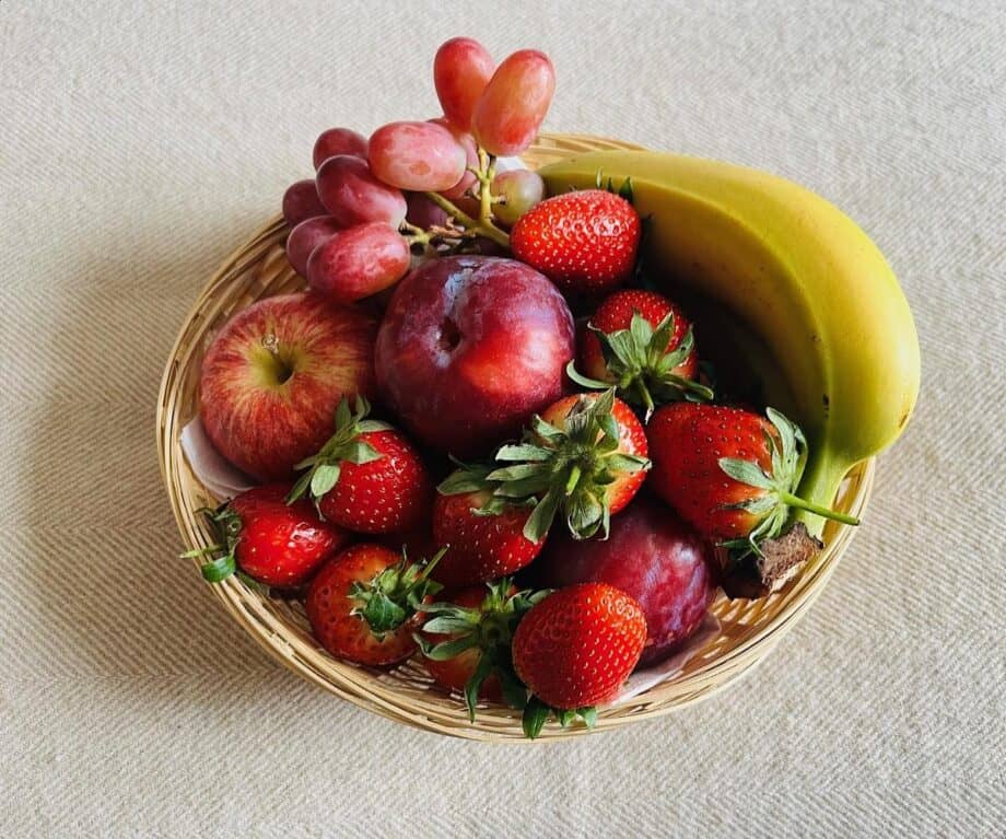 Apples, bananas, grapes, nectarines and strawberries overflow from the fruit bowl in our room.