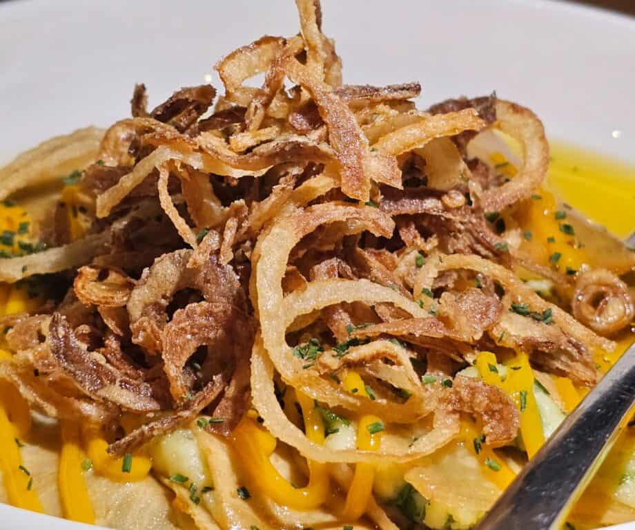 Our main course consists of a series of sharing plates, starting with some delicous celery root fritters with potato-graukäse filling, fried onions, nut butter and egg yolk.