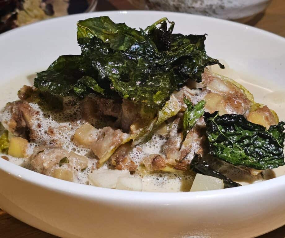 Along with this we have a wirsing roulade (a traditional German dish made by wrapping a filling in wirsing, which is the German word for savoy cabbage) with potato-mushroom-walnut filling, pear-beurre blanc, kale chips