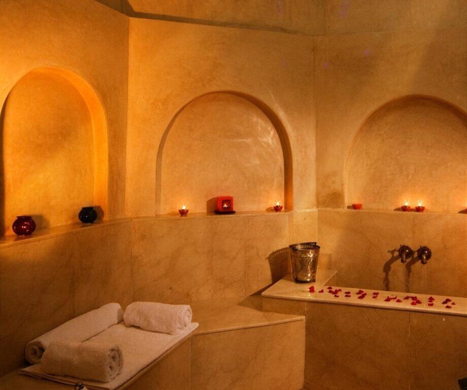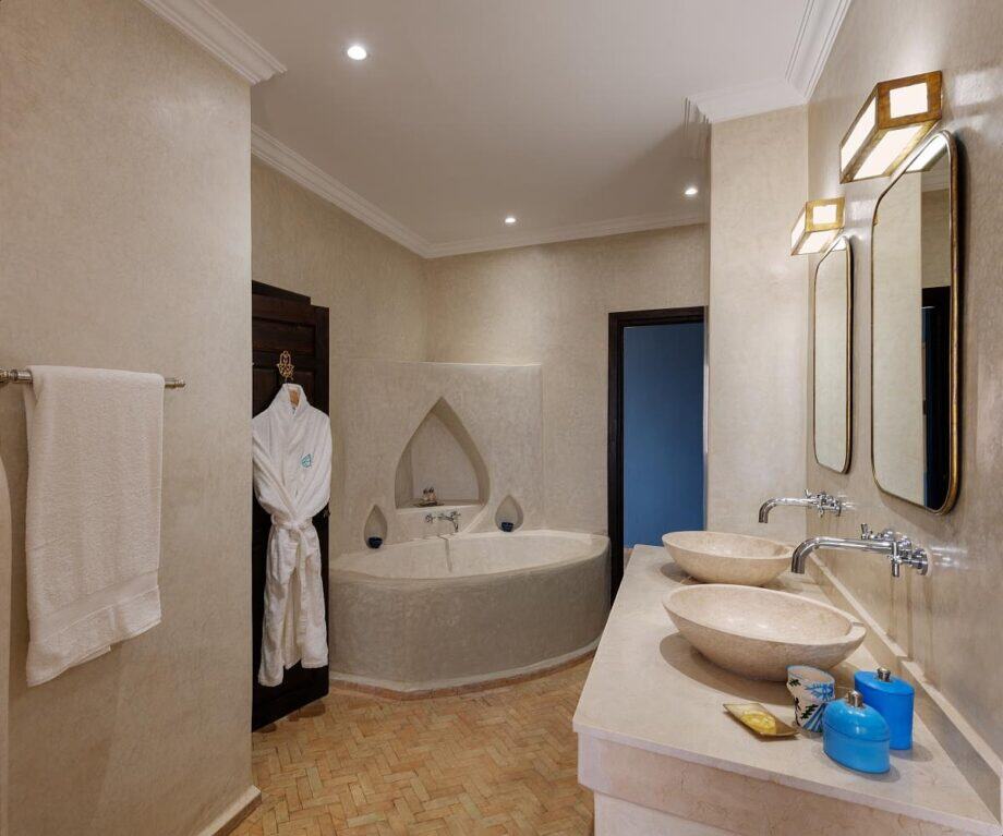 Pure Moroccan indulgence: a deep bath with more mihrab recesses for  candles and a superb rainfall shower. A sumptuous bathroom finished in local style with polished tadelakt plaster.  And this bathroom has a sea view with a window that looks through the suite.