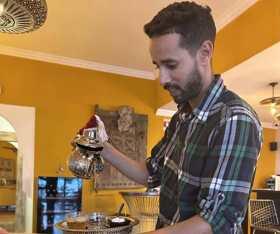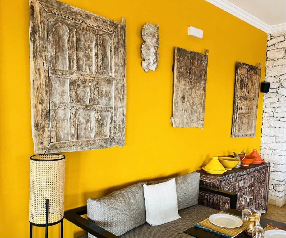 Ancient cedar doors salvaged from Agadir, representing both hospitality and heritage, decorate the walls of the restaurant.