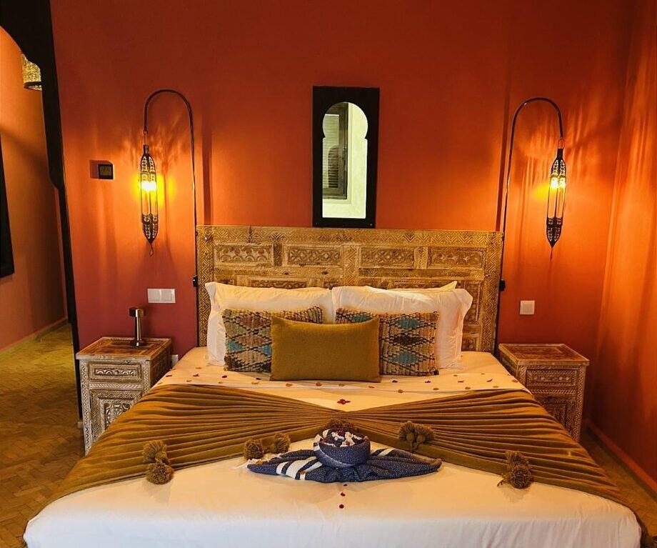 A dark wood marquetry cabinet consumes all our clothes for the week. A sofa, desk and bedside cabinets are lit by brassy Arabian lamps. Mihrab recesses, both aesthetic and functional, host candles.  A minibar, plus Netflix and Prime on the television, are reminders that notionally we are still in the 21st century. The large burnt orange rug may have seen action as a flying carpet in a previous life …