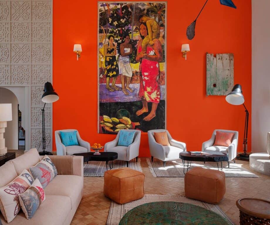 Created from local sandstone, cooling in summer, warming in winter, Kasbah d’Eau, is a boutique hotel of just 17 rooms and suites, with art house design. A calm double-height central atrium pulls in the light, illuminating vivid contemporary abstract art that contrasts with solidly traditional dark furniture.