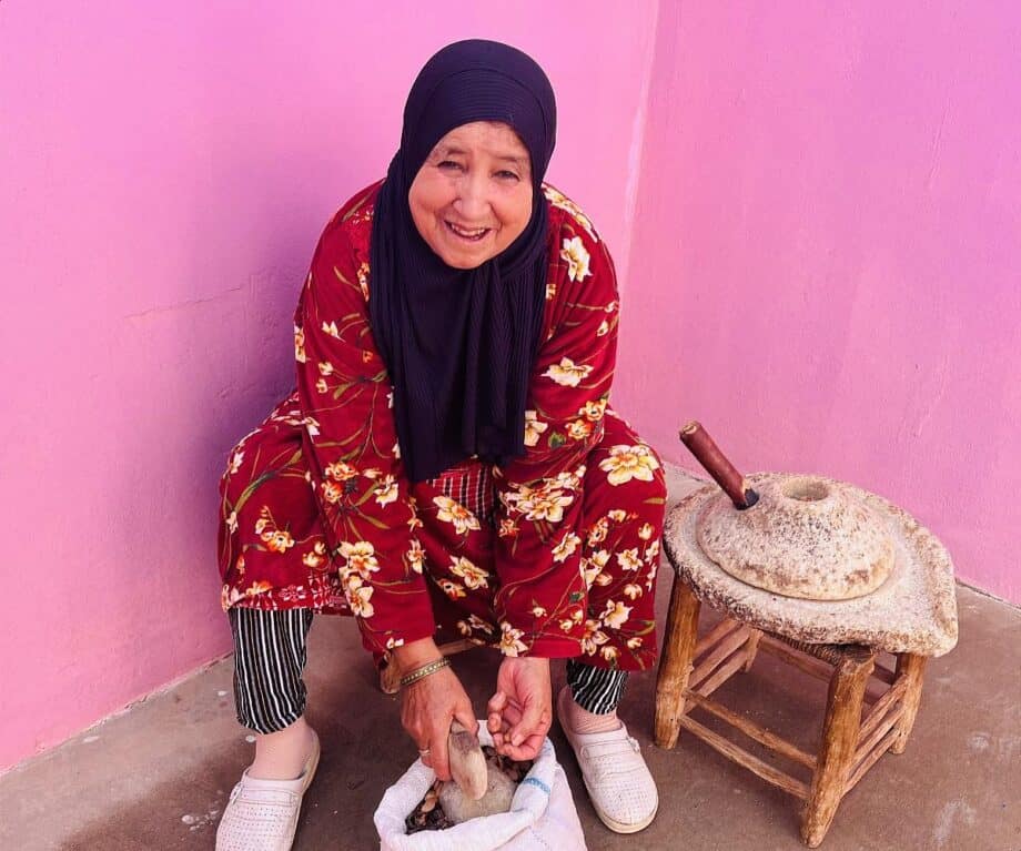 After a lunch of Moroccan salad, chicken tajine, ring ghoriba biscuits and mint tea, Hussain’s mother shows how to grind the liquid gold of Argan oil. Nothing is wasted. If the camels don’t eat the left-over husks they are burnt for winter fuel.