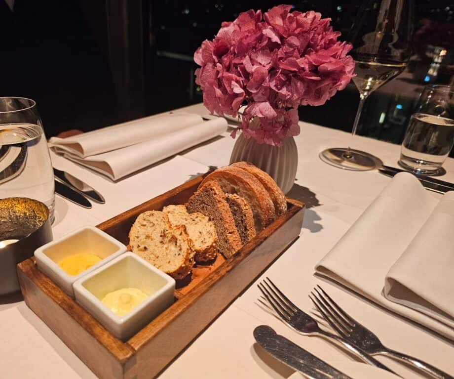 Other than entering a shopping centre to get there, you wouldn’t know you’re on top of a commercial building. The atmosphere is vibrant yet intimate, and busy yet composed. Adjacent to the restaurant, the 360° wine bar and lounge, which is under the same management, offers a chic retreat, perfect for a pre-dinner aperitif or post-meal digestif. Being in such a lofty location, there’s a good view to be had, whether it’s day or night. Our table overlooked the Rathaus Glockenturm (Town Hall Clock Tower).