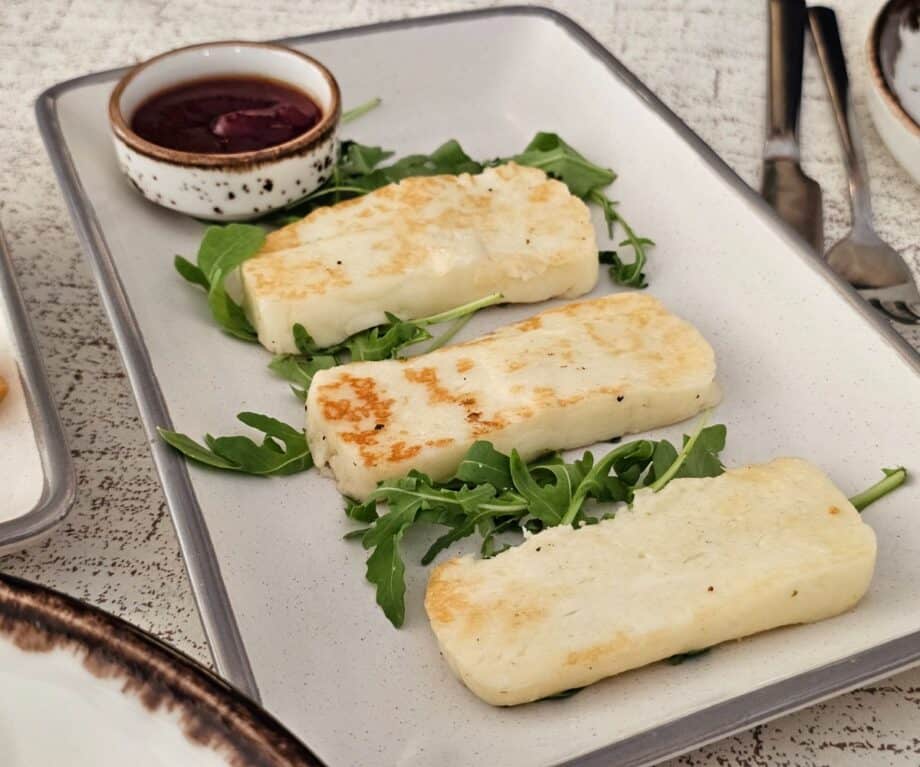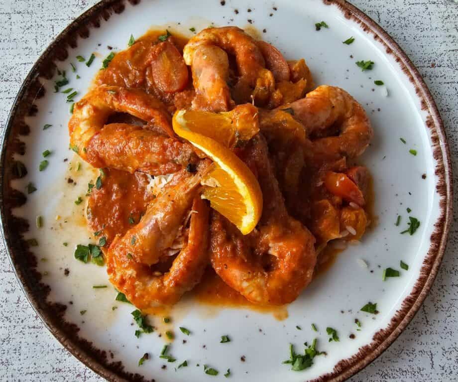 Among our starters are the steamed mussels, in a broth of lemon, garlic and white wine, the halloumi cheese, griddled until golden and served with a sweet chilli marmalade, and – my favourite – the saganaki prawns. The latter are nestled in a sauce of fresh tomato, garlic, and green pepper, with a deliciously indulgent sprinkling of feta.