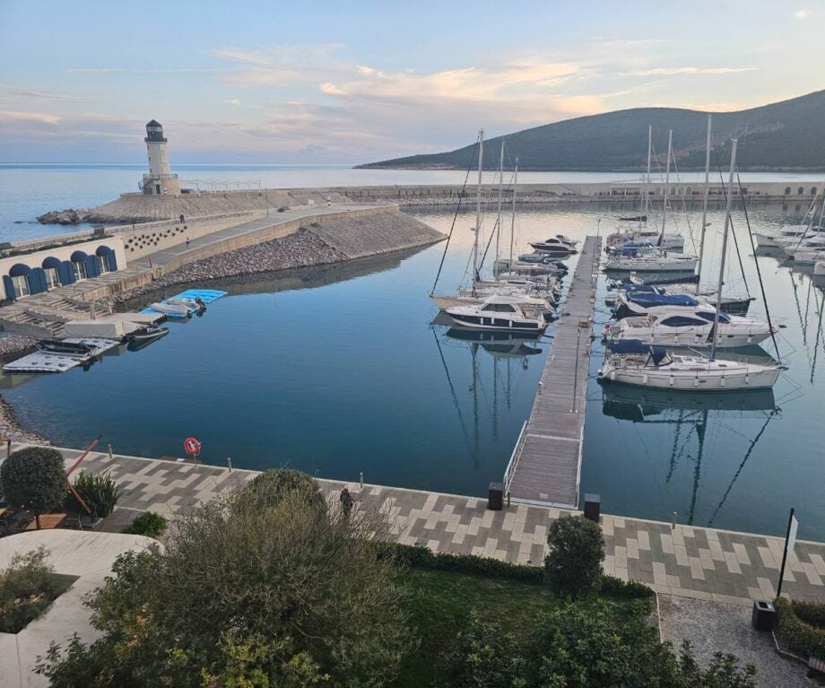 There’s a small table by the window and a balcony with table and chairs that look out over the marina and the distant lighthouse; mornings on that balcony are quietly restorative.
