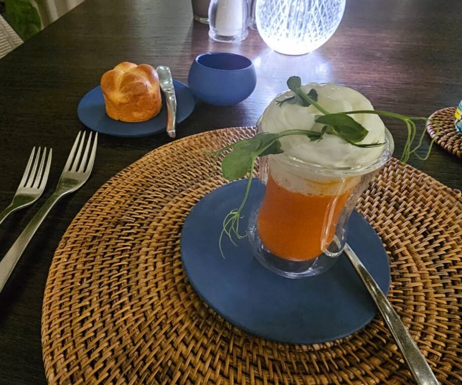 My dinner there began with an amuse bouche of tomato soup, topped with a goats cheese mousse.