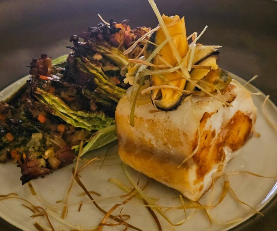 This was followed by a succulent starter of seared Adriatic scallops, crispy chicken skin, rooster reduction and purée trio (celery, broadbeans and peas, beetroot), a main of grilled monkfish served with smoked mussels, kale and proscuitto, a herb and root blend sauce, and leek crisps, and a dessert – it would have been rude not to – of Black Forest cake, consisting of vegan chocolate, coconut ganache, cherry compote, and vegan chocolate sponge.