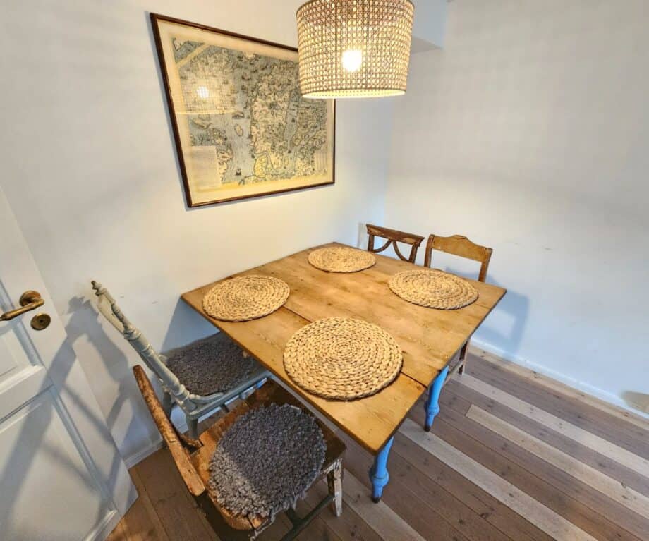 On entering the property, a homely Nordic kitchen with white cabinetry lies immediately ahead. It’s a bright and airy space with a wooden dining table taking centre stage and pendant lighting above it. A wood-burning stove in the corner ensures that this is a cosy haven in the winter months.