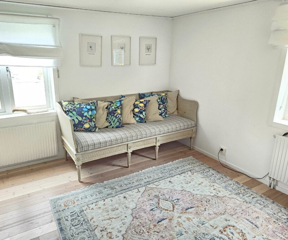 Beyond this is the bedroom with a large double bed and a patterned quilt that adds a touch of colour to the room, and with Utö scatter cushions that remind us of our location in the Stockholm archipelago.