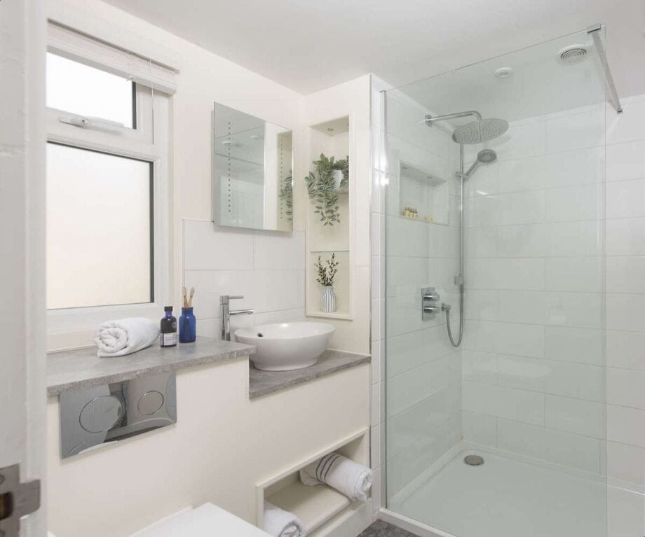 A large walk-in shower, both rainfall and directional, has Elsyl toiletries to hand in the bathroom.