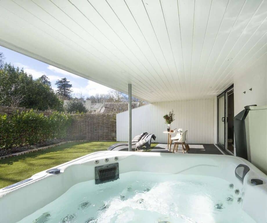 A covered patio hosts the hot-tub, perpetually set at 38 centigrade and serviced twice a day by Little Dunley’s staff. All we have to do is uncover it, step in and relax.