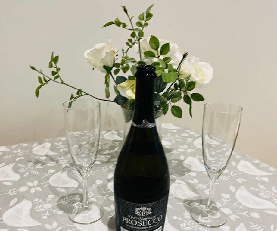 A bottle of sparkling Prosecco is part of the welcome pack that also provides tea, coffee, sugar and milk.