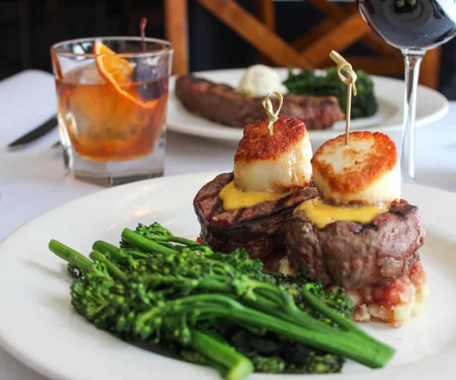 The beef road leads to the fillet trio, a perfect beef dish sauced with butter, blue cheese, and chimichurri. A steak needs a sidekick, and here, the cheese-loaded au gratin spuds are the ideal match. The ambiance is vast, reminiscent of the Old West, with a sunken bar area and two private dining rooms featuring historical art from the era. It goes way beyond the food as they are masters of matching the cocktails and wine with any beef dish. Go for the Upside-Down Manhattan with Amaro, Laws Rye, and Bitters.