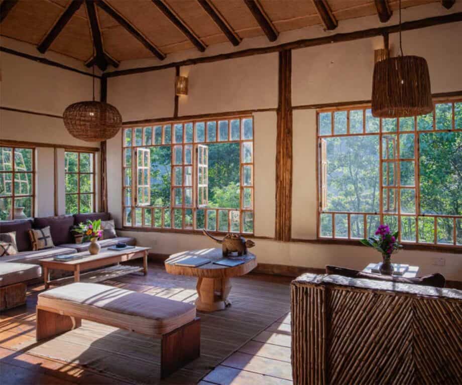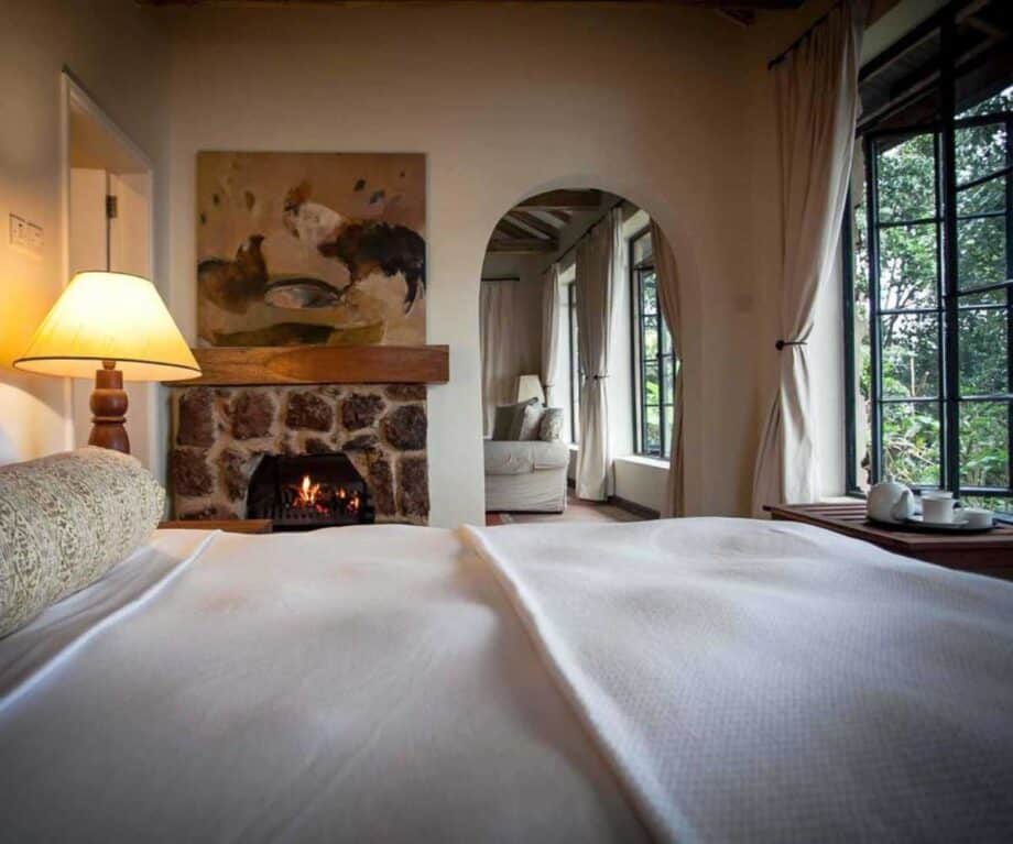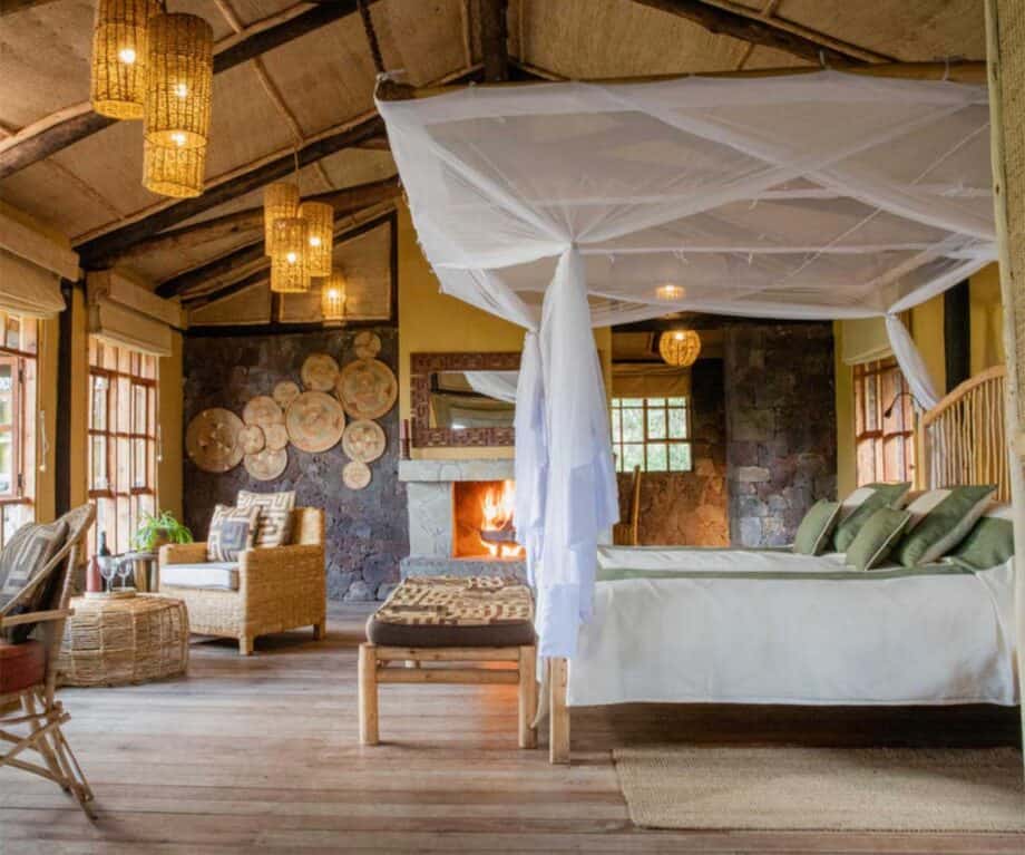 This lodge also has just eight rooms, but this time, they are spacious private cottages with their own private sitting rooms, fireplaces, big picture windows which look out toward the Virunga Volcanoes, as well as outdoor verandas with sitting areas.