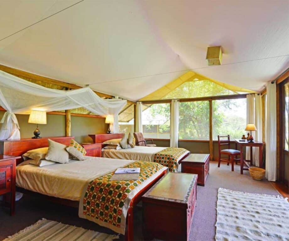 The low impact, eco-sensitive camp is designed to respect and complement the environment, meaning nature is truly all around you. The rooms are nestled amongst the trees along the river, and troops of Black-and-White Colobus and Vervet monkeys may swing by overhead, and keep an eye out for hippo in the river!